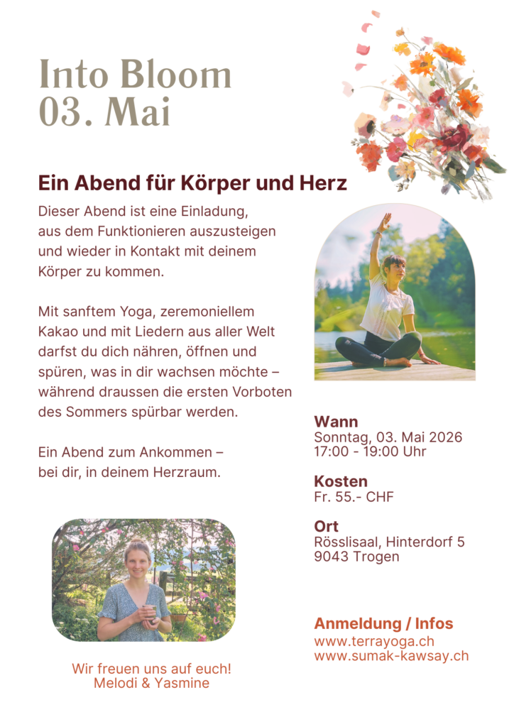 Mit sanftem Yoga, zeremoniellem Kakao und mit Liedern aus aller Welt darfst du dich nähren, öffnen und spüren, was in dir wachsen möchte – während draussen die ersten Vorboten des Sommers spürbar werden.