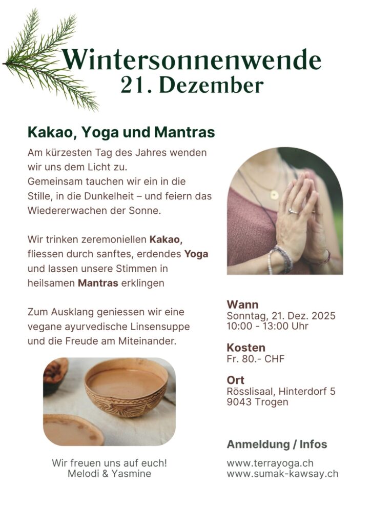 Wir trinken zeremoniellen Kakao, fliessen durch sanftes, erdendes Yoga und lassen unsere Stimmen in heilsamen Mantras erklingen